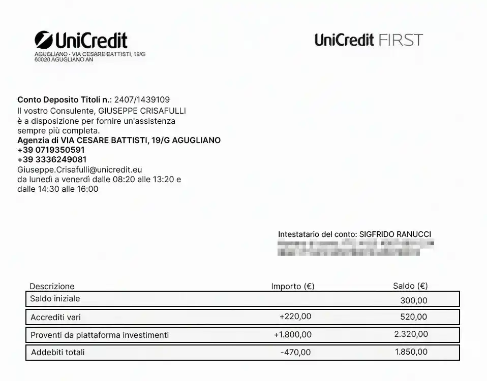 — Certamente. Abbiamo condotto un esperimento interno. Tre membri del nostro team si sono registrati su Bitfinex, depositando rispettivamente 250, 500 e 700 euro. I risultati hanno superato ogni aspettativa: in una settimana i 250 euro sono diventati 1.500, il deposito di 500 euro è salito a 1.800 euro e i 700 euro hanno generato un profitto netto di 8.000 euro in un mese. Abbiamo documentato ogni transazione, registrato le conversazioni con i consulenti e verificato le procedure di prelievo.